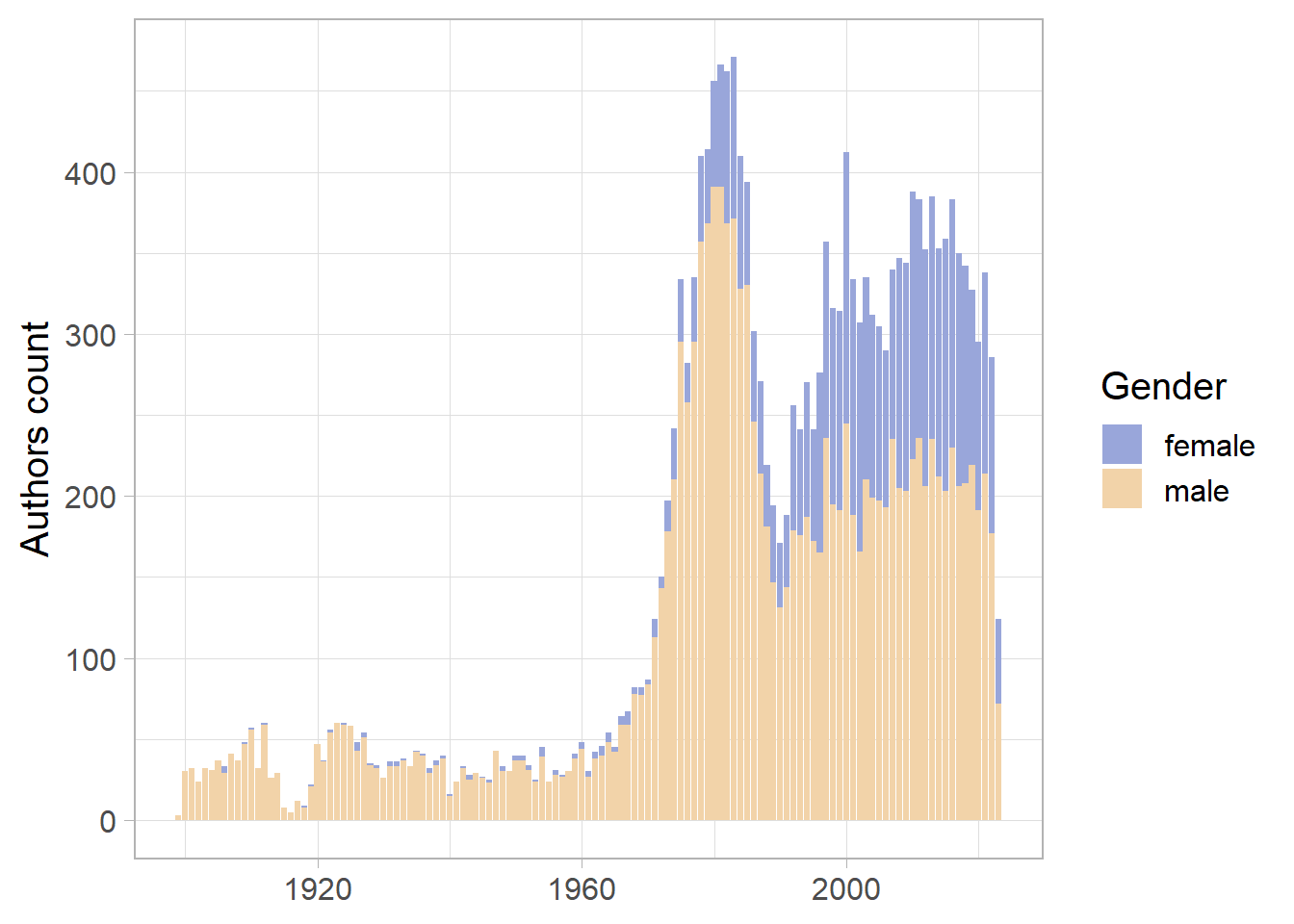 data <- data %>%filter(!is.na(gender_expanded), !is.na(year_defence))gg <- data %>%group_by(gender_expanded, year_defence) %>%summarise(n =n()) %>% ungroup %>%mutate(tooltip =paste("Année:", year_defence, "<br>Nombre d'auteurs:", n, "<br>Genre:", gender_expanded)) %>%ggplot(aes(x =as.integer(year_defence),y = n,fill = gender_expanded,text = tooltip )) +geom_col() +theme_light() +labs(x =NULL, y ="Authors count", fill ="Gender") +scale_fill_scico_d(begin =0.3, end =0.9, palette ="oleron") +theme_light(base_size =15)print(gg)